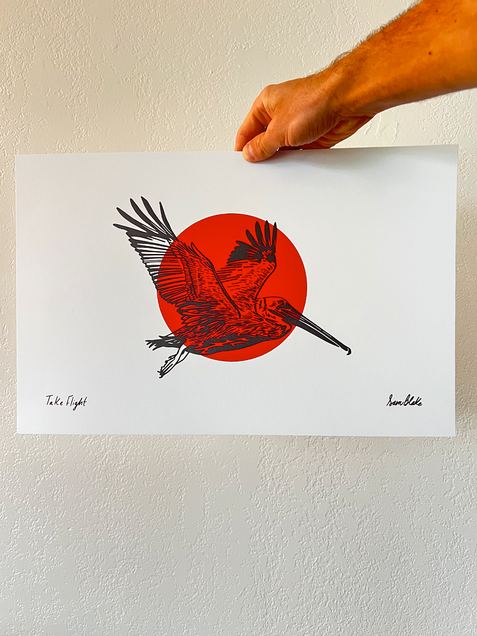 Originating from a lino block print, this digital version gives a crisp view to the brown pelican in flight. One of my favorite birds, this pre-historic looking creature has a majestic character and has been recorded to live as long as 43 years while averaging 15-25 years. Their wings can span to an average of 7' and can hold up to 3 gallons of water in their mouths, three times the amount their stomachs can hold.